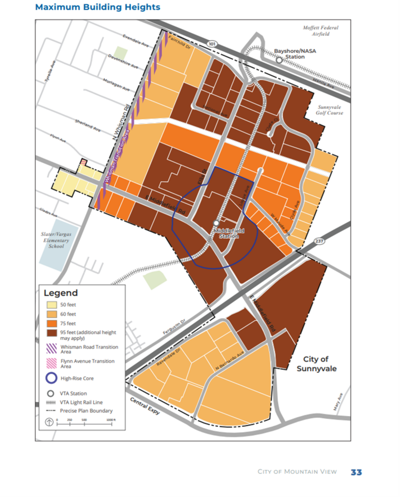 (2) If we transfer the density to the East Whisman Precise Plan in the Light Rail Station transit-oriented development zones, no city upzoning of the precise plan area will be needed. This is because the East Whisman Precise Plan already contains zoning for 6-9 story buildings. As was said often in the SB79 hearings, “cities get credit for the upzoning that they have already done”. By our measurements, there is enough capacity in just the area south of Middlefield Road between North Whisman Road and SR 237 to accommodate the SB79 zoning transfer to preserve the downtown commercial retail district. This area contains no neighborhood with single-family or duplex buildings \hat would be impacted by having high-density residential built nearby.